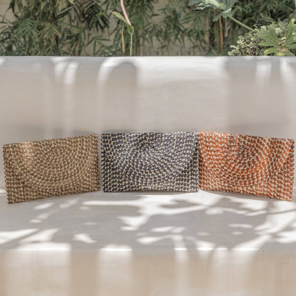 Stylish, sophisticated, and fun, this rattan ombre clutch is the perfect carrier for your daily necessities. The Interior features a soft fabric lining as well as a change pocket. A vintage inspired piece with a modern and playful twist. Available in Amber, Clay, and Black. Size: 11"x7" Material: Lontar Leaf