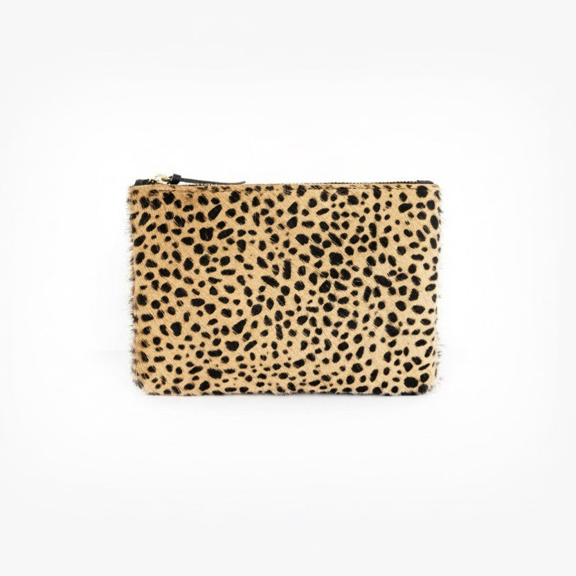 Use as a small clutch or wallet. This bag is the perfect size to throw in a larger purse or carry on its own. Fits a smartphone. - Hair on cowhide exterior - Linen interior - YKK Brass Zipper - Measures 8”W x 6”T Each bag is unique. Due to the variation in coloring and patterning of each material the bag you receive may be slightly different than the photos shown.