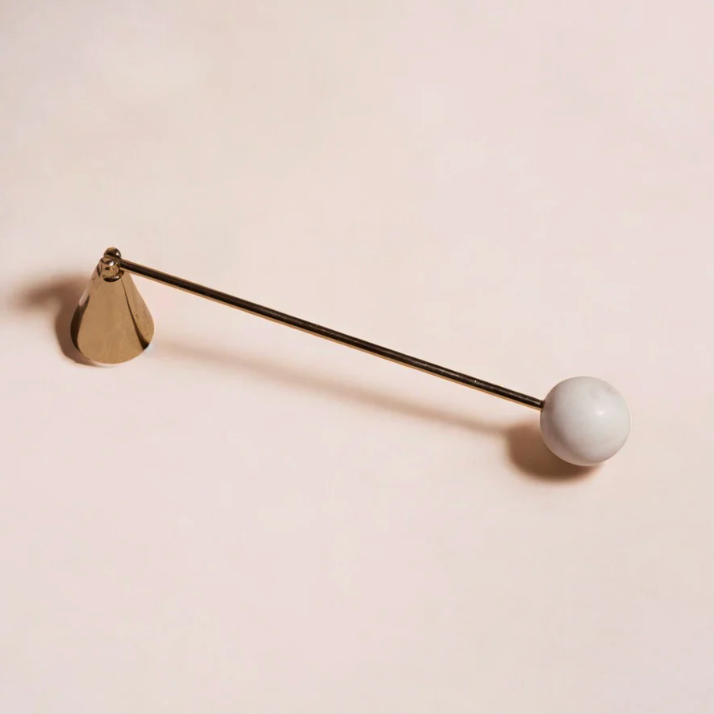 Stainless Steel Brass Finish Snuffer with White Marble, Handcrafted in India, Fair Trade Certified. ________Stainless Steel and Marble Dimensions: 10" L. x 2" W. x 1.5" H.Care: Wipe Clean Only ________