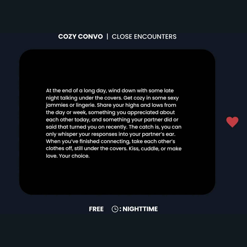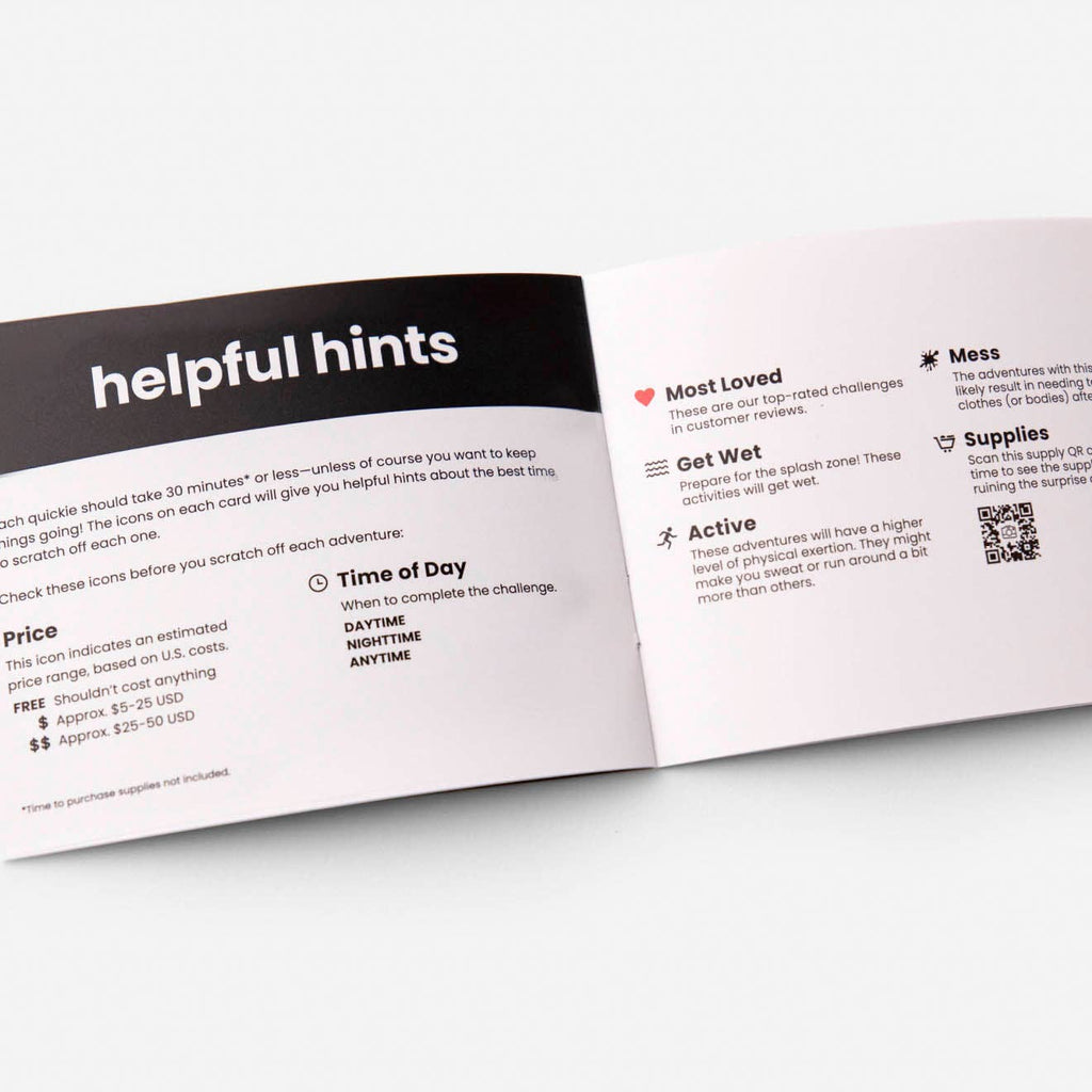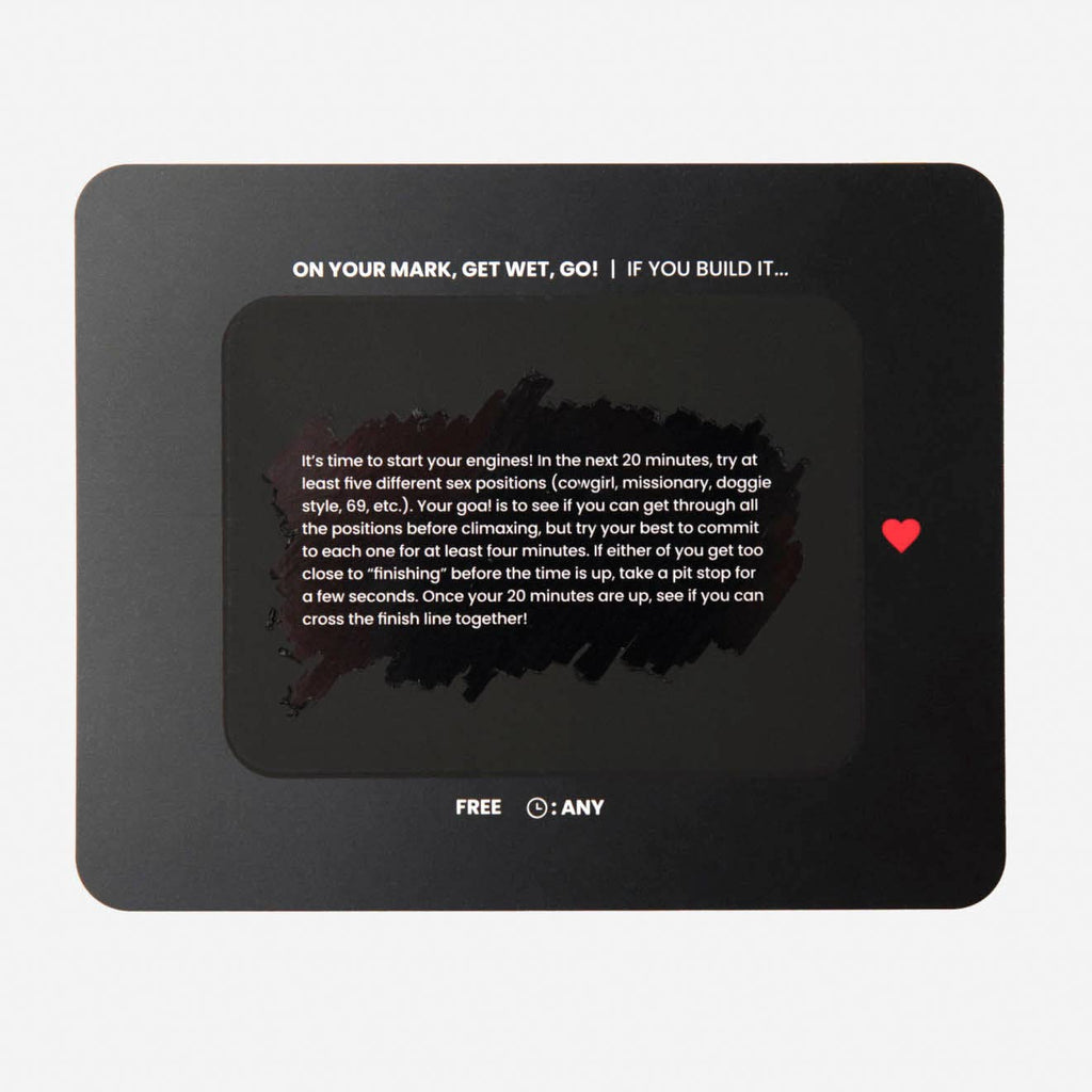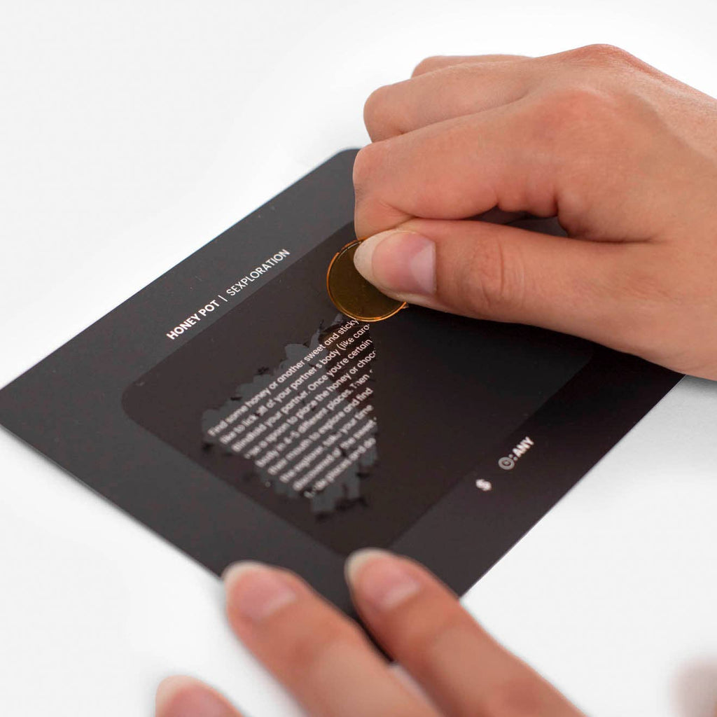 You’re never too busy to get busy With 30 fun and sexy challenges you can do in 30 minutes or less, these scratch-off cards are the perfect way for you and your partner to have a good time in less time. Explore outside of your sexual habits, quickly connect, and create memories…. In Bed Date night has never been easier. Each date can be completed in under 30 minutes – unless you want to keep things going longer ;) Helpful hints are located on every card to help choose the Quickies that’s right for you and your partner. Supplies and prep will be minimal. Laughter will be abundant. How It Works: Choose a challenge Use the hint icons! This will help you know what your date will look like based on budget, weather, and location.