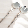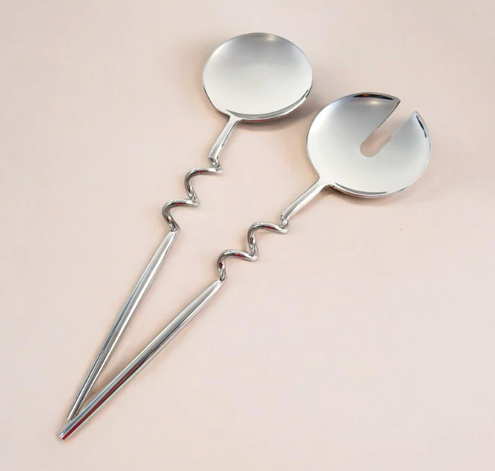 Stainless Steel Finish Cutlery Set of 2 servers, Dishwasher Safe, Handcrafted in India.________Stainless Steel, Brushed Brass FinishDimensions: 10.6" L. x 2.7" W.In stock ready to shipCare: Dishwasher Safe ________