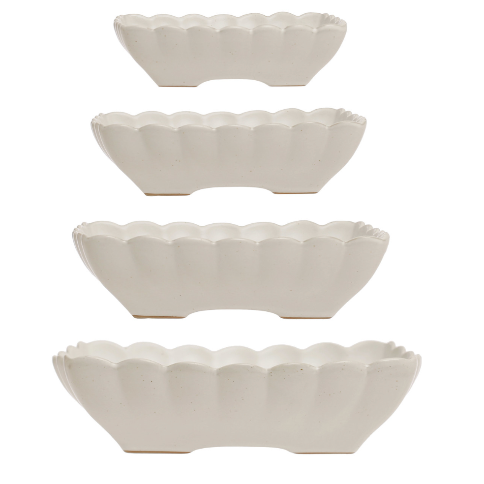 These elegant Ashton Nesting Bowls in matte white stoneware feature a scalloped edge, adding refined charm to any table. The set of four offers versatile sizes perfect for serving appetizers, sides, or desserts. Durable and easy to care for, they complement both casual and formal dining with sophisticated simplicity