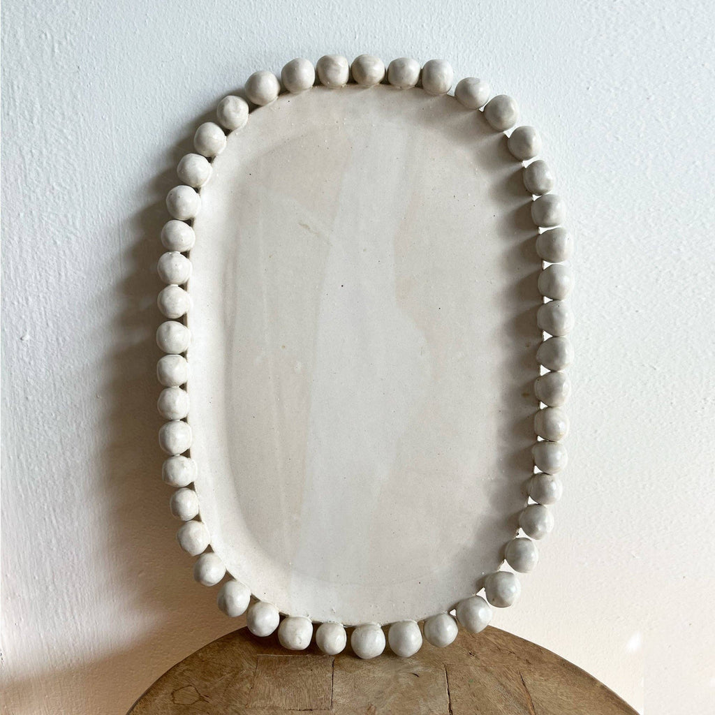 Generously sized platter with a dramatic beaded edge. Per uzshe, each one is handmade so there are variations in sizing of bobbles and glazing is perfectly imperfect. * glazed stoneware * one-of-a-kind * microwave & dishwasher safe * NOT oven safe * 15" x 10.5" x 1"