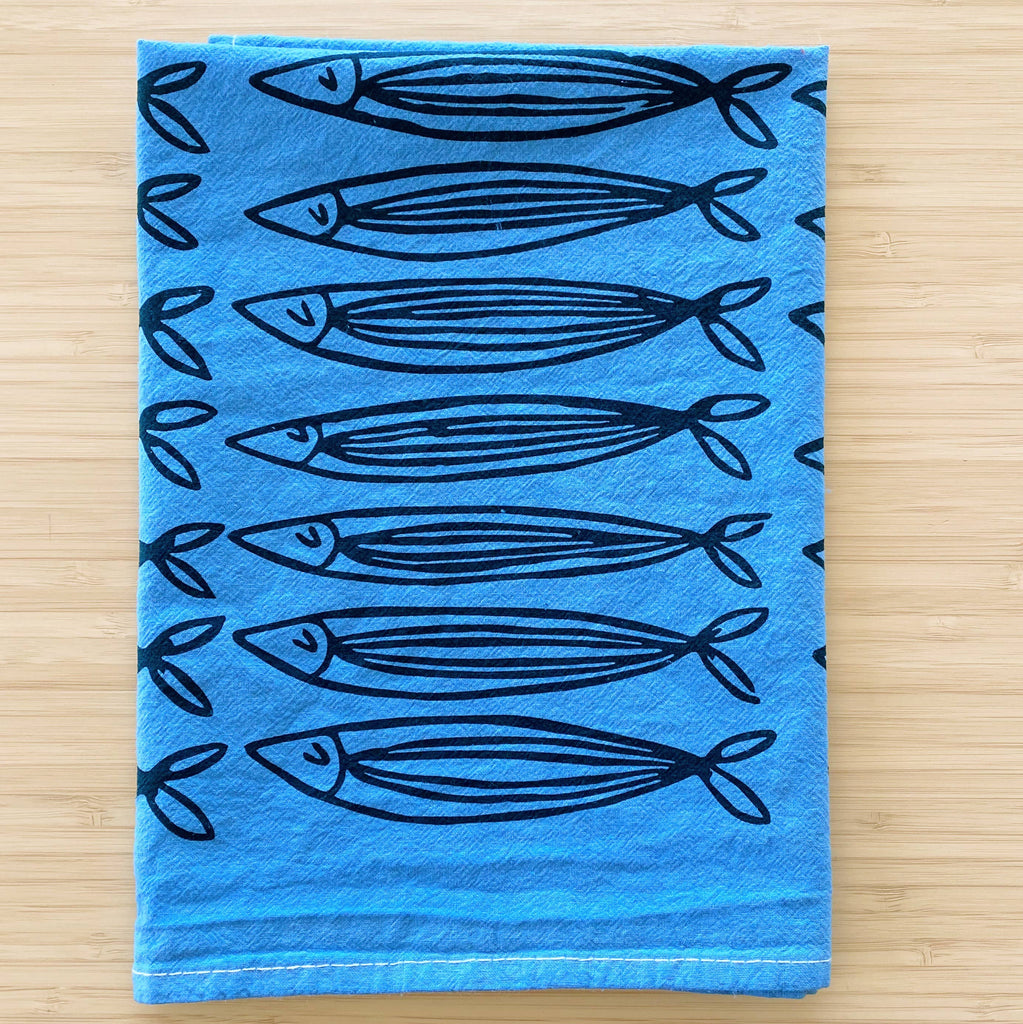 This Blue Sardines Tea Towel features an original design and illustration by Julie Peach. Hand-dyed and made from 100% cotton, it is silkscreened at Denver’s only Green-Certified print shop and elegantly packaged with a hangtag. Measuring 20 inches, it combines refined craftsmanship with sustainable practices.