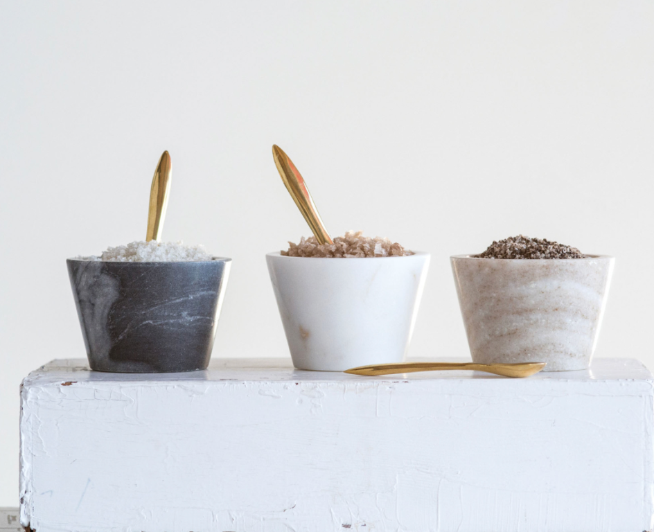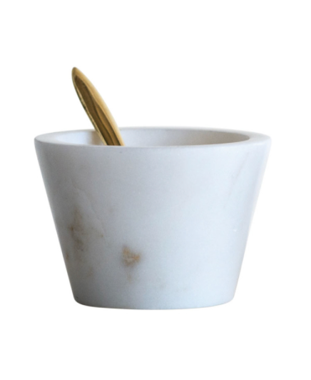 Spice up your kitchen this beautiful marble pinch pot. It comes with a brass spoon, adding a touch of elegance to your cooking routine. Perfect for sprinkling that extra bit of flavor on your dish. (And it'll look great on your countertop!)