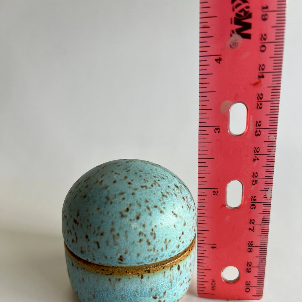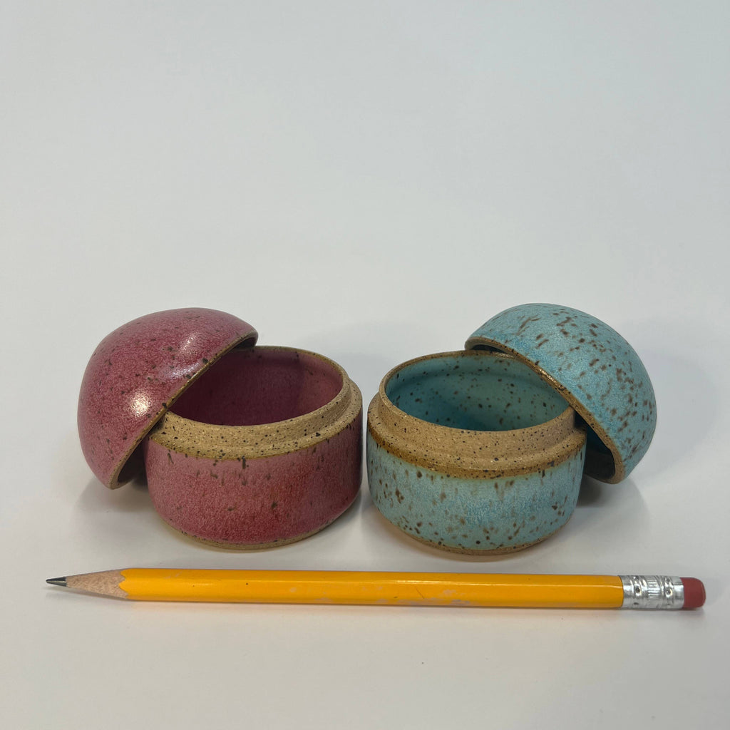 A multi-purpose box, great for keeping a ring by your bedside or a special pair of earrings or cufflinks on your dresser. More photos coming soon! Dimensions: 2. 25"W x 2.75”H Microwave and dishwasher safe. All pieces are made individually by hand; therefore, color, size, and shape may vary slightly from piece to piece.