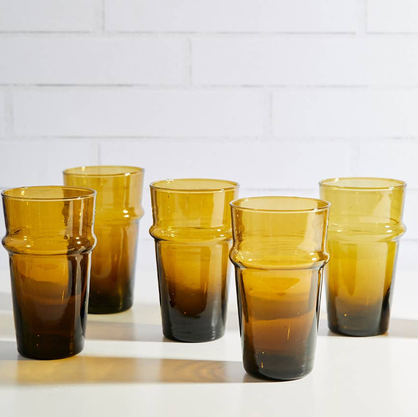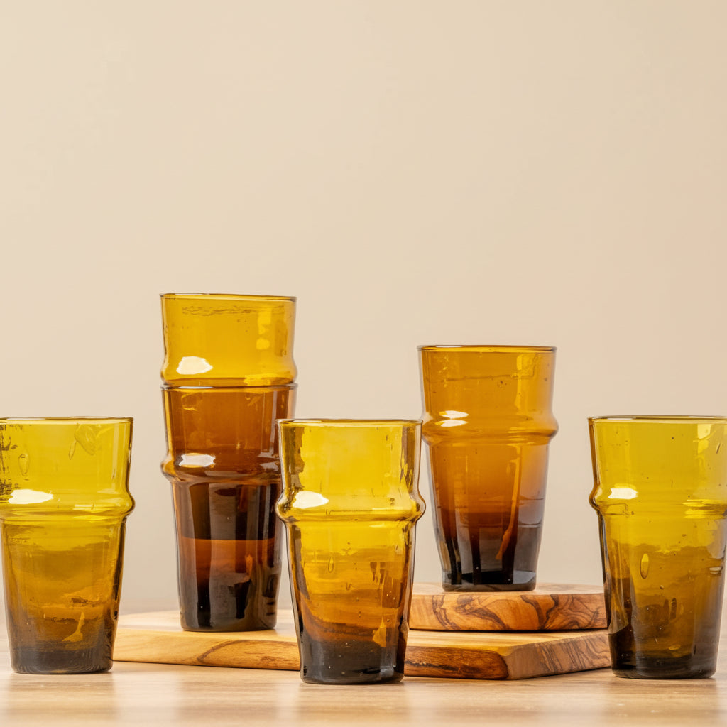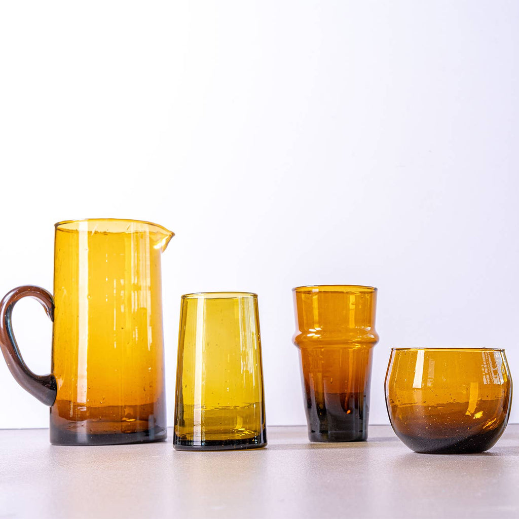Our Moroccan glassware is made from recycled wine bottles, beer bottles, jars, or other glass containers. Slight variations in hue/color can arise due to variations in temperature, the amount of glass used, or even the artistic choices made during production. These differences contribute to the unique charm and individual character of each piece. The handblown construction is evident in the bubbles suspended in the glass itself, and the organic forms that the vessels take. Even better, these lovely glasses stack - saving space or making room for lots and lots of them. Care - Dishwasher safe, but please note: handblown glass is sensitive to drastic temperature changes. 11 fl oz
