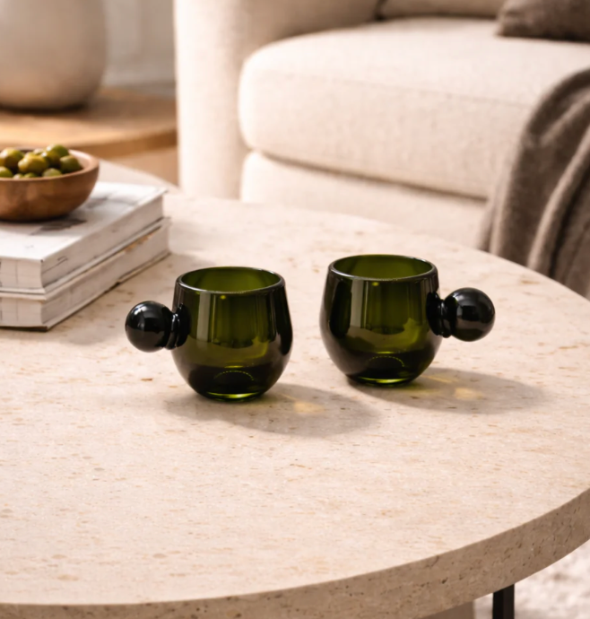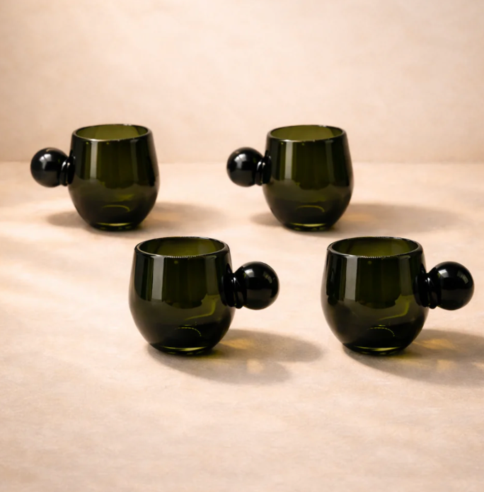 Handcrafted from recycled green glass and mouth-blown by skilled artisans in Guadalajara, Mexico. Each piece reflects traditional craftsmanship, and subtle variations are to be expected due to its handmade nature.