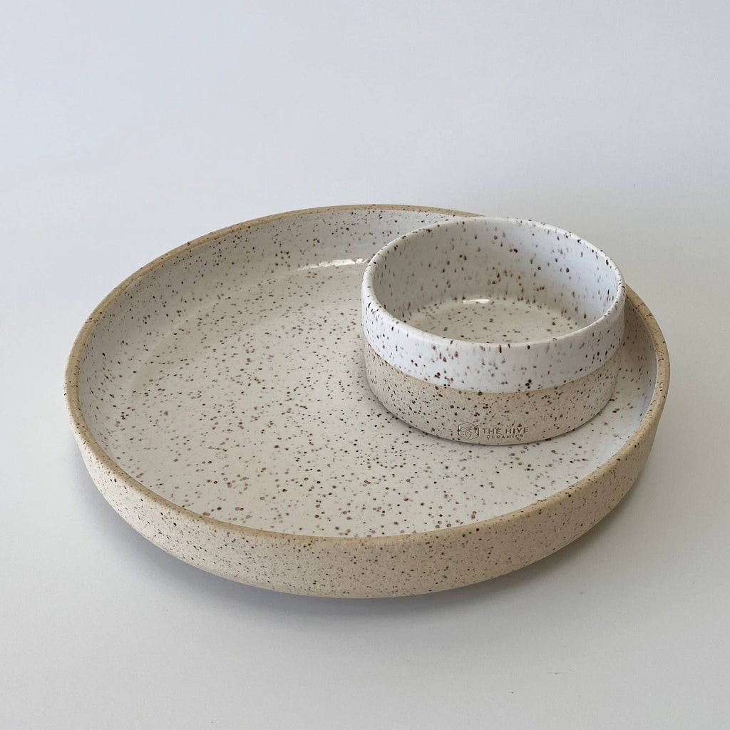 Elevate your entertaining with this artisanal Hive Serving Set, a collection of handcrafted ceramic pieces designed for refined presentations. The generous dish, measuring 8 1/2" wide by 1 1/4" tall, accommodates charcuterie and dips with understated elegance, while the coordinating bowl—3 1/2" wide and 1 1/2" deep—completes the composition. A refined choice for the discerning host.