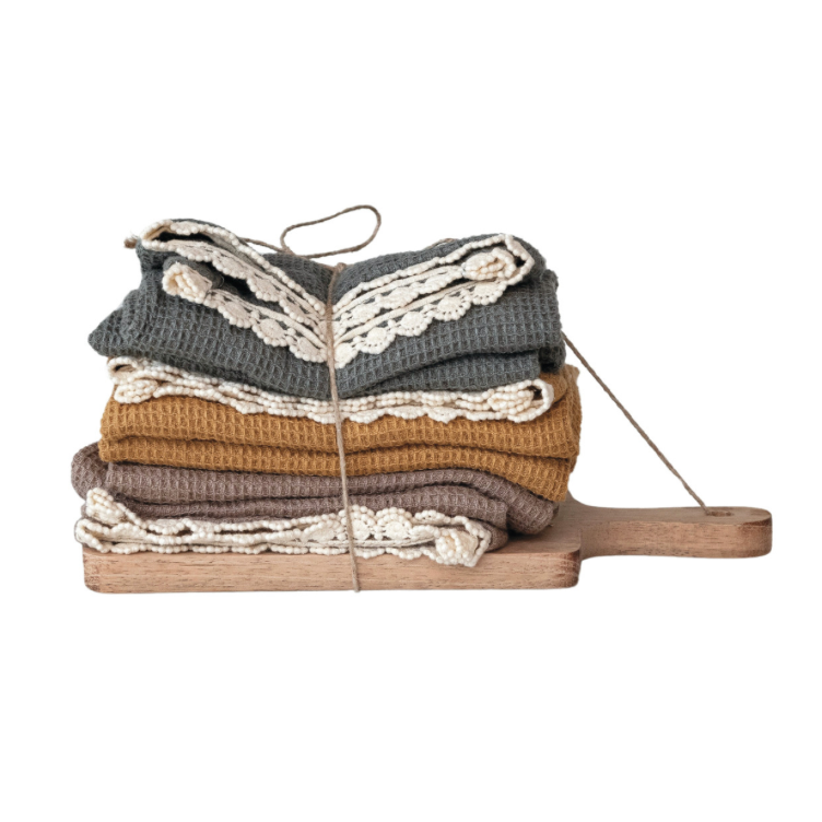 28"L x 18"W (3) Cotton Waffle Weave Tea Towels w/ Crocheted Trim & 10"L x 5"W Mango Wood Cheese/Serving Board w/ Handle, Multi Color & Natural, Set of 4 Tied w/ Jute