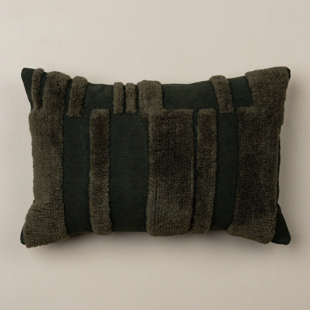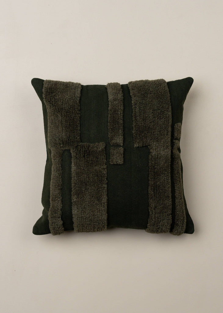 A textural cushion crafted using cotton canvas and wool tufting in a deep forest tone. The variation in texture adds quiet depth and warmth. Filled with a feather insert for a comfortable, relaxed feel.