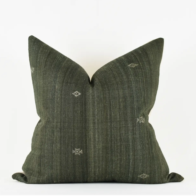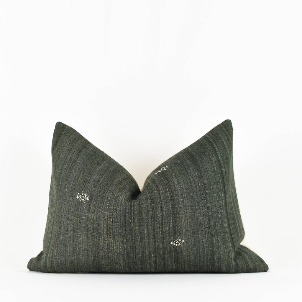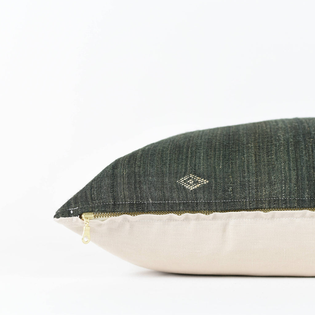 The Dahlia Pillow cover is crafted from handwoven silk fabric sourced from Gujarat, India. It features an exposed brass zipper and a natural linen back, with a black lining for added durability. The design presents black and grey tones accented by subtle green and tan woven details. Variations and minor imperfections inherent to vintage and handmade textiles add to its unique character.