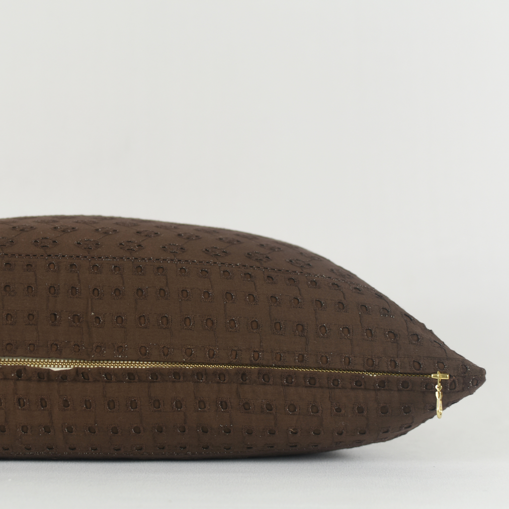 The Soroya Pillow cover is crafted from 100% cotton, featuring distinctive cutouts and textured details. It includes an exposed brass zipper and is double-sided, showcasing the same fabric on both front and back. The pillow also has a matching-colored lining for added refinement. Proudly handmade in the USA, each piece presents slight variations and charming imperfections inherent to vintage fabrics and artisanal craftsmanship. Available in a rich dark chocolate brown shade.