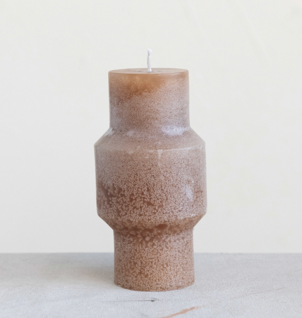 This intricately carved totem pillar candle showcases a striking sculpturesque design. Mix and match the hues and sculptural silhouettes of our artfully crafted totems and tapers for a refined candlelight arrangement on a dining table or mantelpiece.