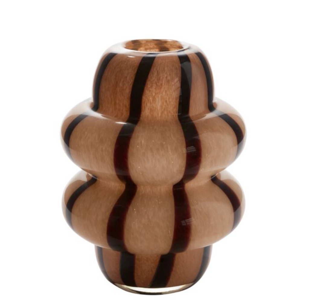 With its stacked, curvy sculptural shape & bold striped pattern, the handmade solid colored glass Sutton Vase is a stunning standalone piece or floral vessel. The dark red wine-hued stripes stand out against the light brown ground color, while surface variation shows up in the lighter-toned sections. A weighty base keeps the vase stable. Display as a focal point on a bookshelf, console or dining table with fresh or dried florals.