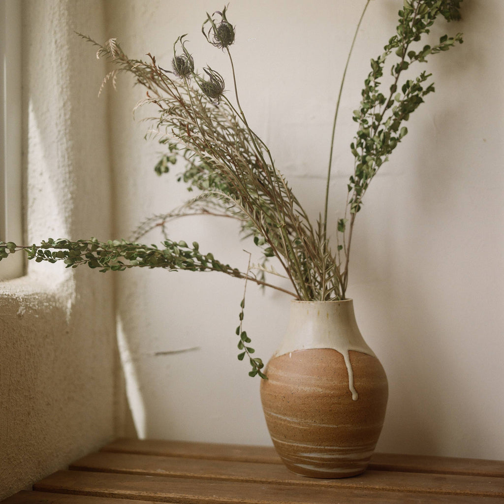 Discover the understated elegance of our handcrafted Yucca Vase, a stunning blend of stoneware and porcelain that brings organic beauty to any space. Each piece features a distinctive pier base glaze that adds depth and character to your décor. Skillfully made by hand, this neutral-toned vase celebrates the natural artistry of the craft—color variations in shape and size as well as subtle pattern differences are inherent to its handmade nature, making every vase truly one-of-a-kind. Perfect for displaying fresh or dried botanicals, this versatile vessel complements modern, minimalist, and eclectic interiors alike.