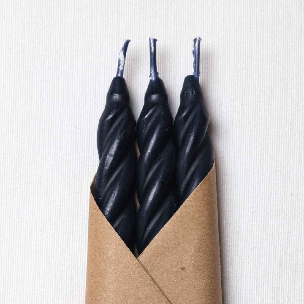 Our Night Beeswax Taper Candles Set comes with three matching hand-crafted 9” spiral beeswax candles. These candles are made with pure beeswax, cotton wicks and natural dye. We hand-craft each candle in small batches in our studio in the Catskills, NY. Each candle lasts for approximately 9 hours, or 27 hours per pack. *All orders ship with plastic-free packaging.