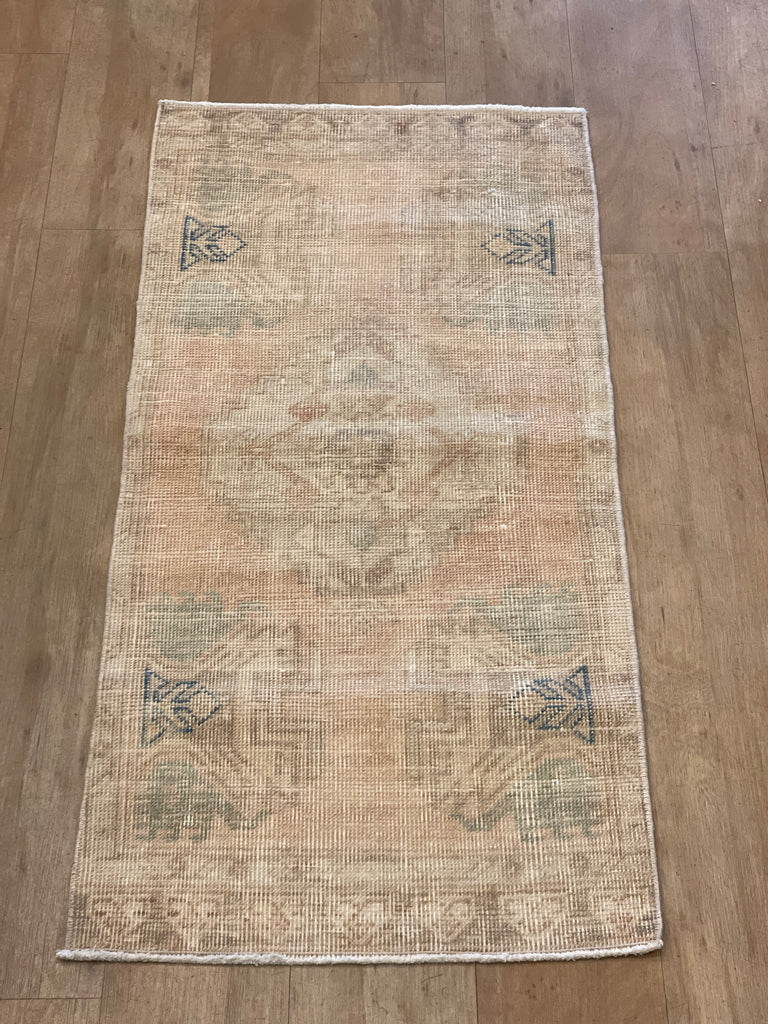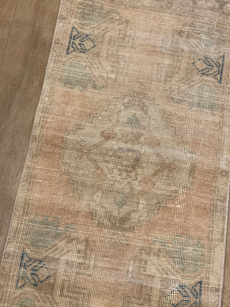 Indulge in the sophistication of our Amara Rug. Handcrafted in Turkey, this elegant vintage rug features a subtle blend of taupe, blush, and blue and green, adding a touch of warmth to any space. Perfectly sized for in front of a door or in your bathroom. It will elevate your interior with a touch of luxuriousness.