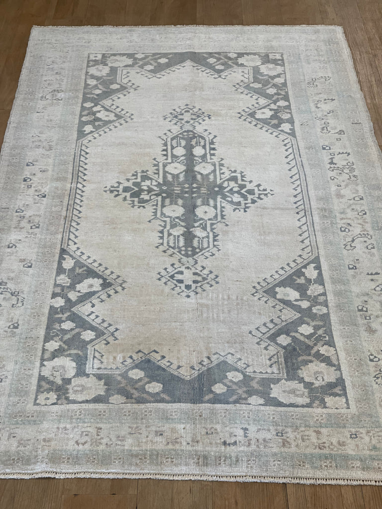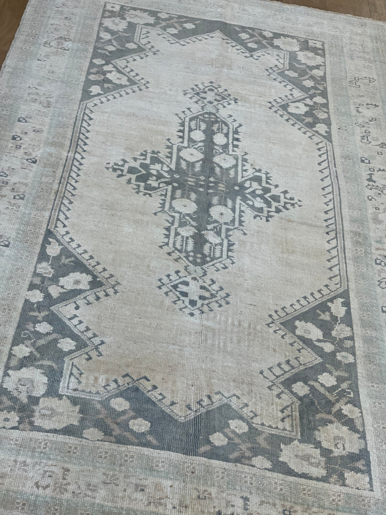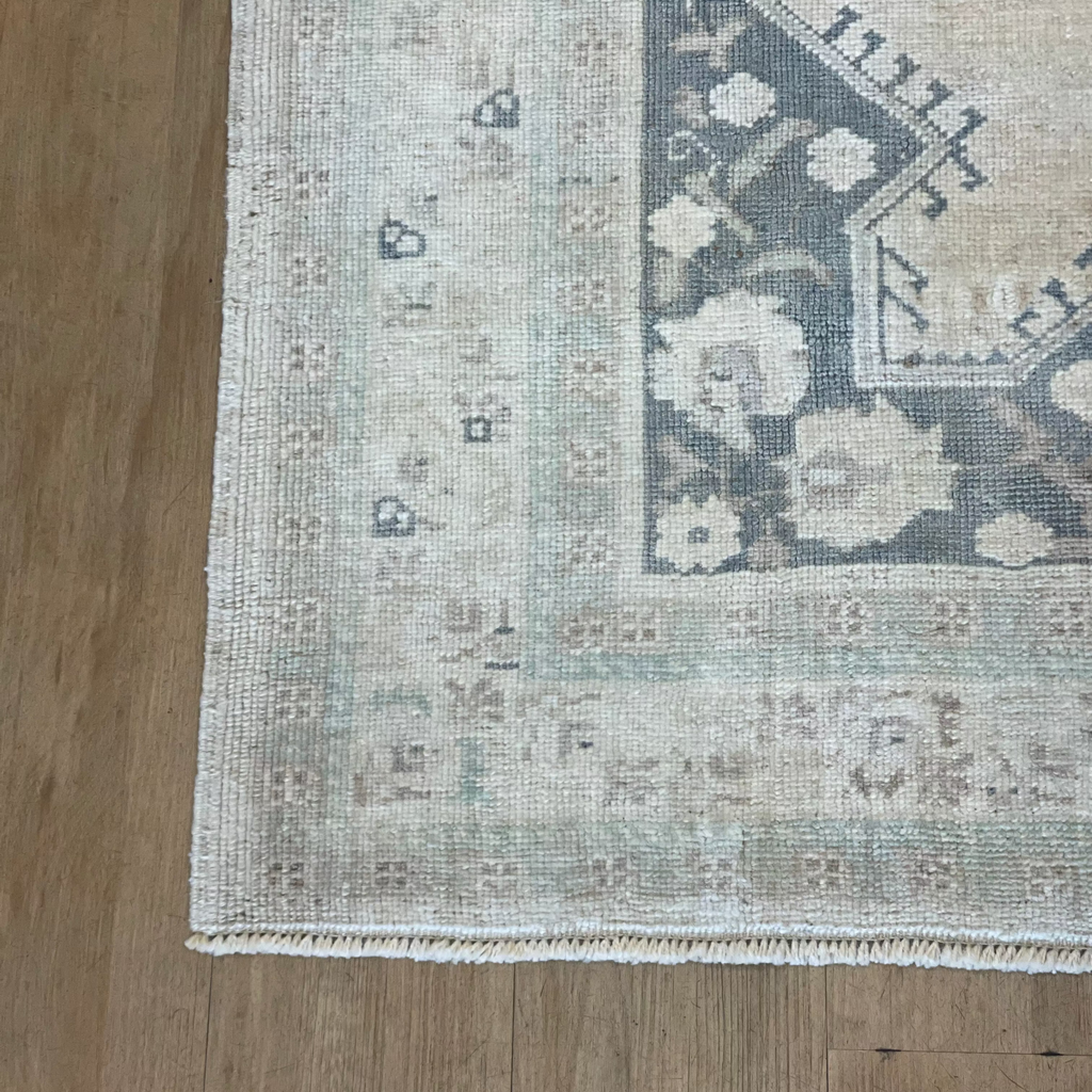 Indulge in the sophistication of our Angela Rug. Handcrafted in Turkey, this elegant vintage rug features a subtle blend of cadet blue, oat and mint adding a touch of warmth to any space.