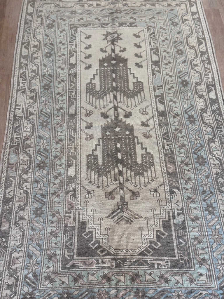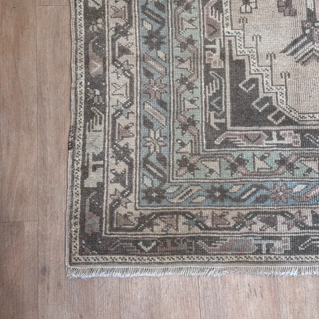 Indulge in the sophistication of our Easton Rug. Handcrafted in Turkey, this elegant vintage rug features a subtle blend of taupe, cream, and mint/blue adding a touch of warmth to any space.