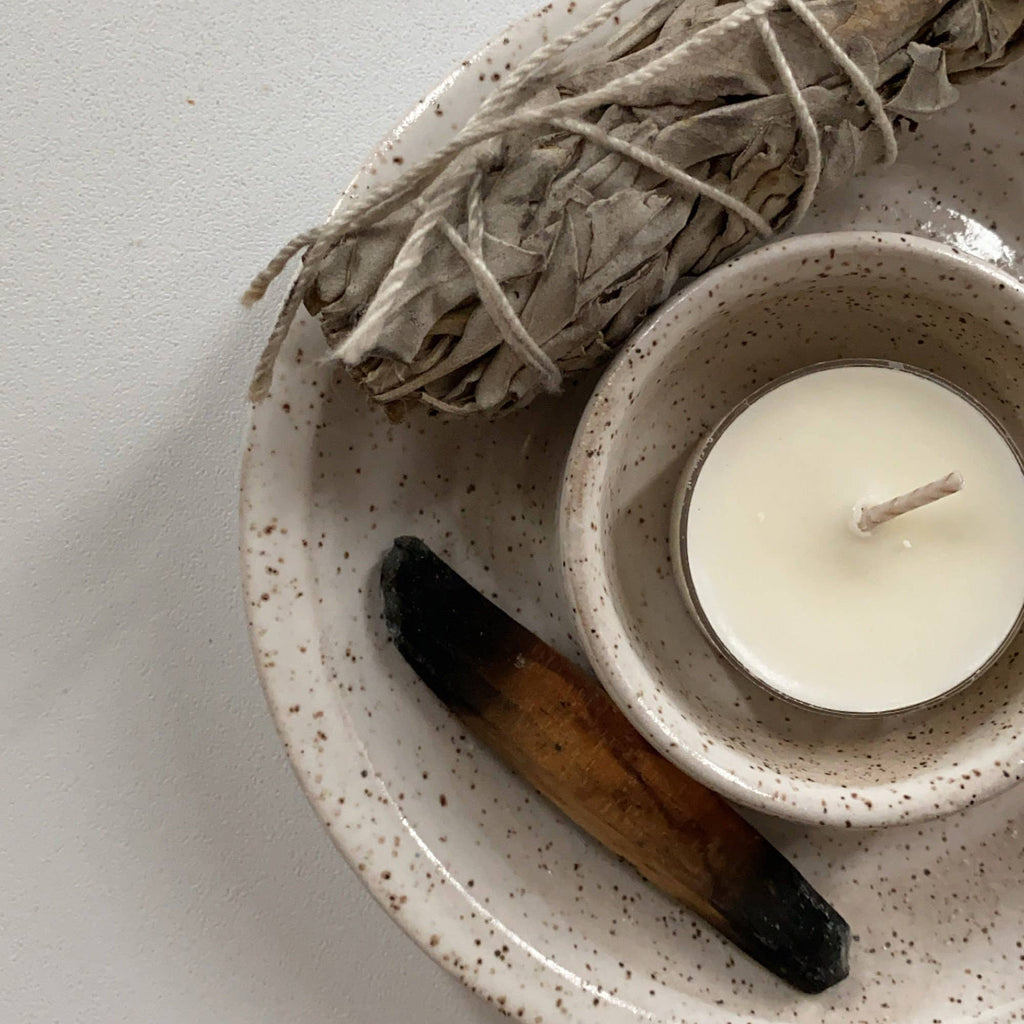 Ceramic Smudge Bowl | Jewelry Dish | Handmade Candle Holder Handmade, wheel-thrown ceremony dish to infuse intention, beauty and presence into your space. Use it as for incense, a home for jewelry, sage and palo santo, a small candle, or anything you like. even olives! Dip-glazed in a speckled gloss white.