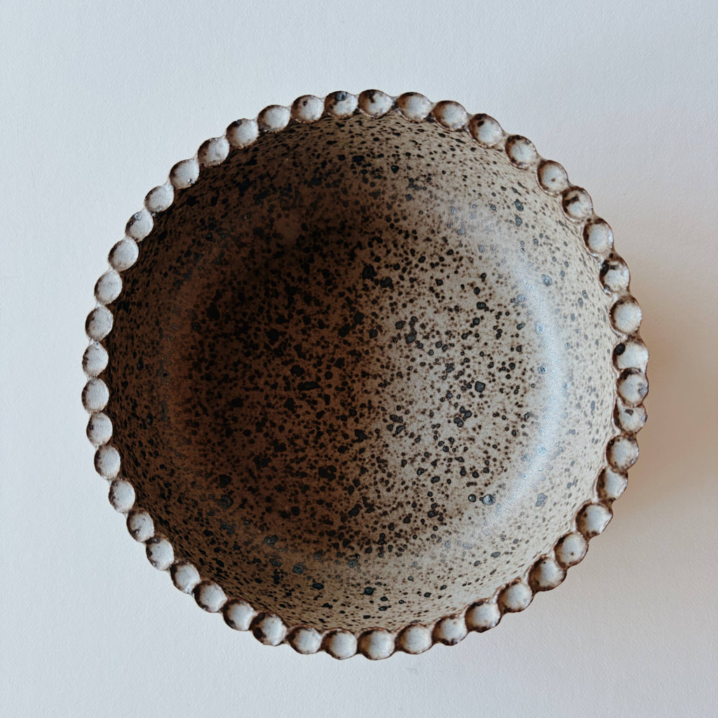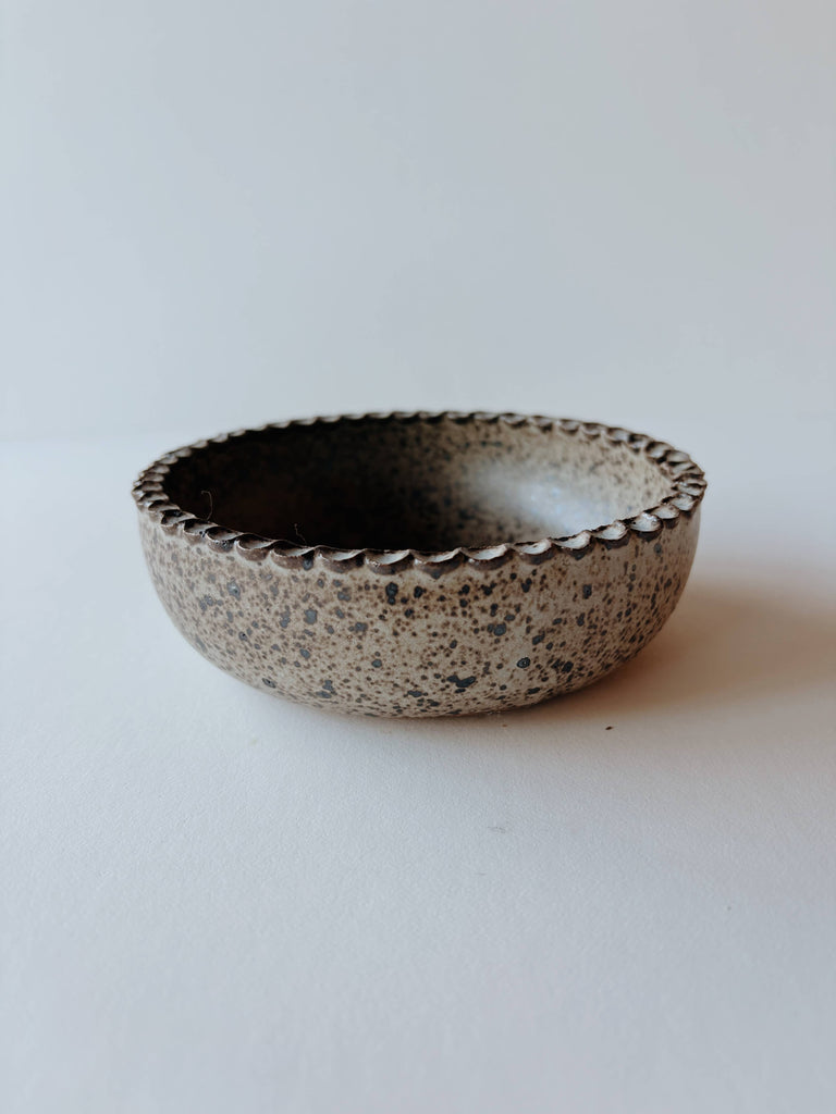 2" tall x 5" wide A matte grey speckled bowl with decorative detail along the rim. Handmade in Berkeley, CA by Coastline Ceramics. Dishwasher and microwave safe.