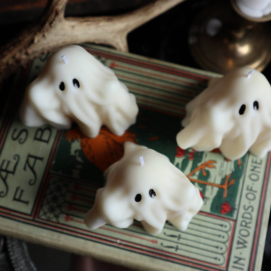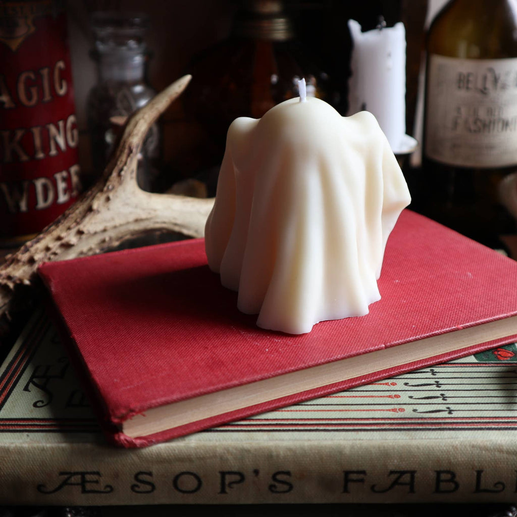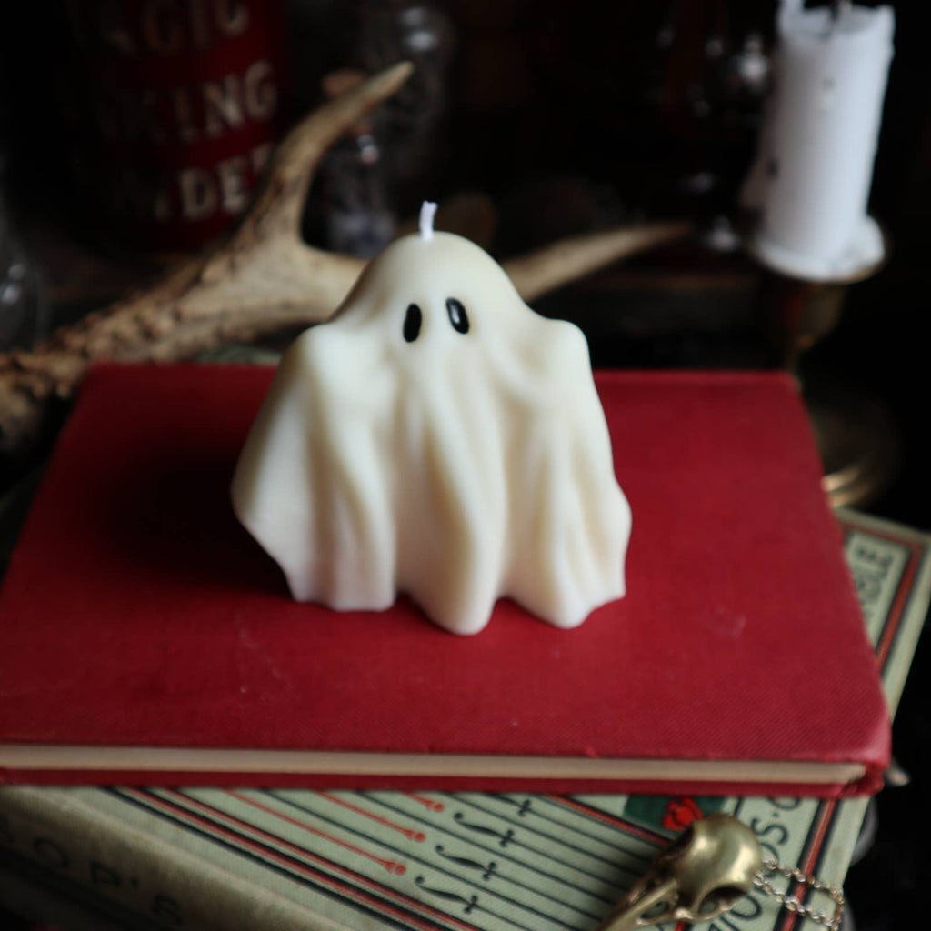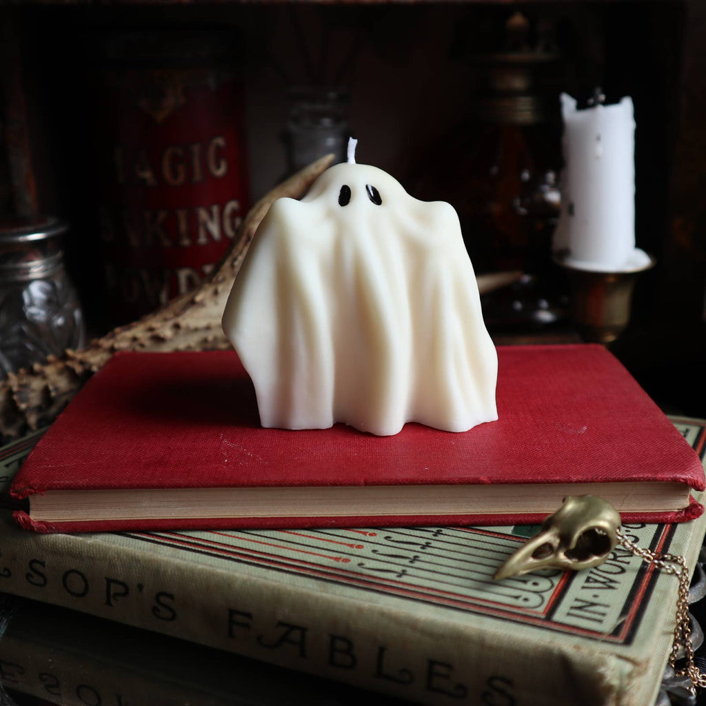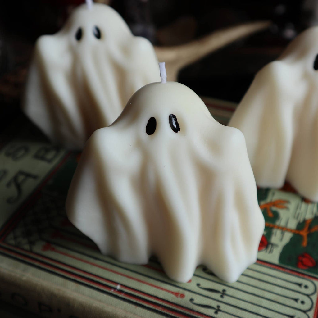 Boo! Meet our spooktacular 'lil ghost candle! This cute little ghost is here to haunt your heart and your space; during Halloween, spooky season, or year round. Unscented vegan soy wax, hand-painted "eyes" cotton wick. Height: 3 inches Width: 2 inches Unscented Soy Wax