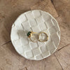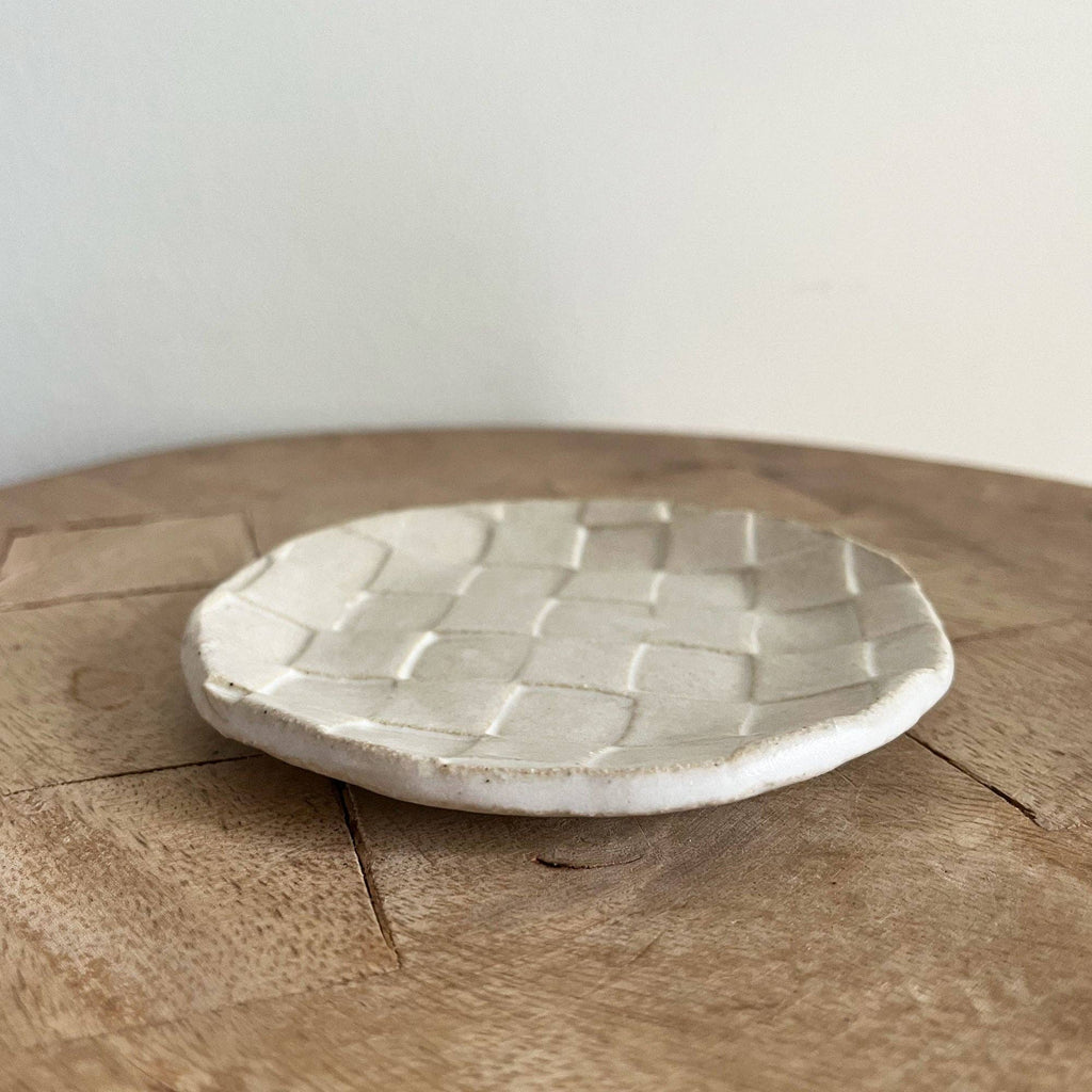 Tiny trinket dish with a hand-stamped checker pattern. * 4" diameter * glazed stoneware * each one is unique