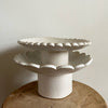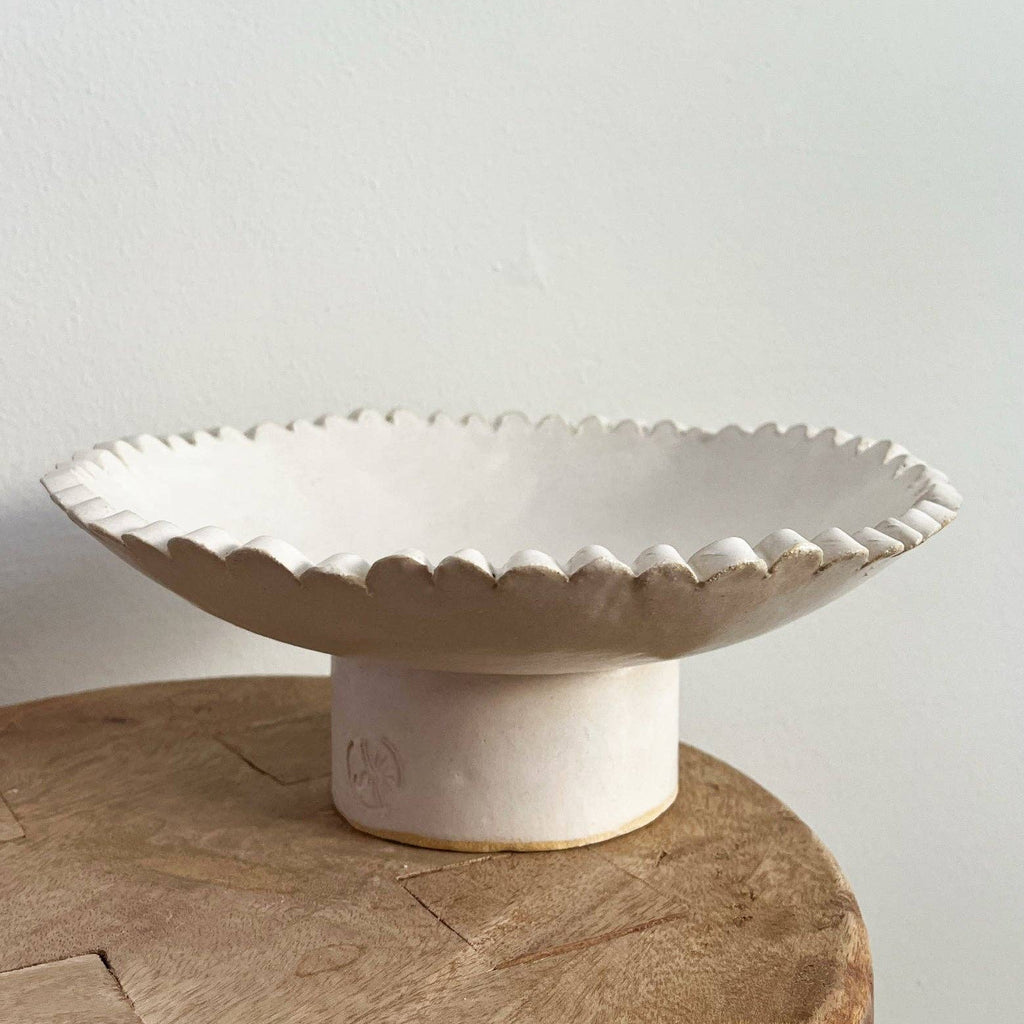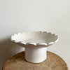 Meet your new favorite table showstopper—a stoneware pedestal bowl with a playfully scalloped edge that's hand-cut to perfection. Dressed in a creamy satin white finish, this beauty is artisan-made, so yours will be totally one-of-a-kind. Perfect for serving, displaying, or simply admiring as the stylish centerpiece it was born to be.