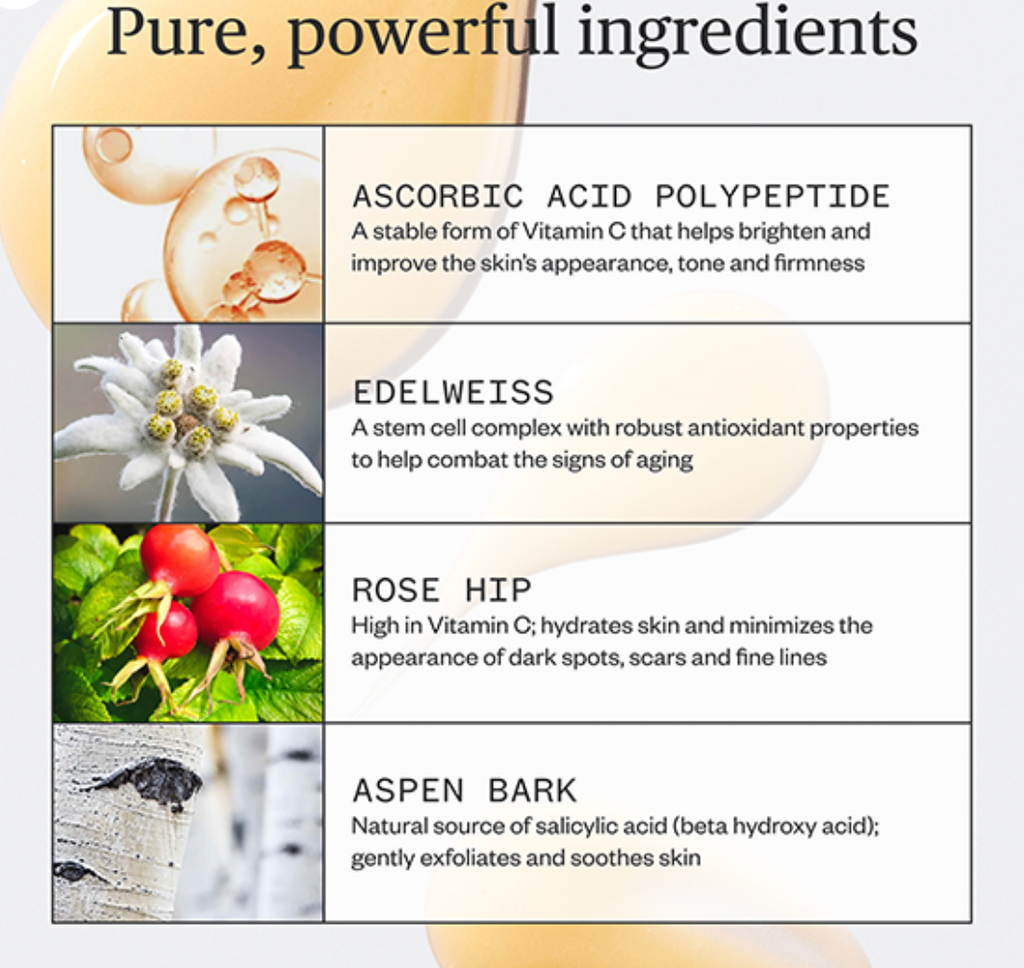 A concentrated, corrective serum for even-toned, radiant skin. This featherweight face serum contains a potent and long-lasting form of vitamin C that brightens and smooths skin’s tone and appearance, while providing instant hydration.